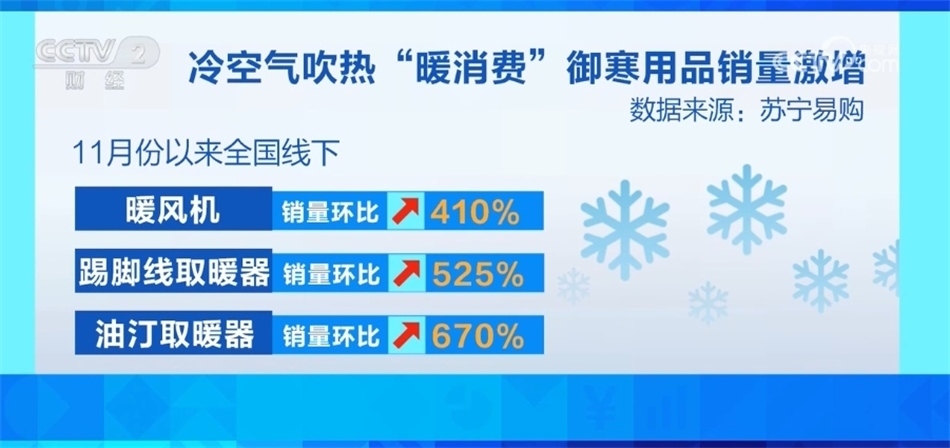 ?????? 數(shù)據(jù)顯示,11月份以來(lái),某家電賣場(chǎng)全國(guó)線下暖風(fēng)機(jī)銷量環(huán)比增長(zhǎng)410%,踢腳線取暖器銷量環(huán)比增長(zhǎng)525%,油汀取暖器銷量環(huán)比增長(zhǎng)670%。此外,某電商平臺(tái)上,暖鞋器、發(fā)熱圍脖、水暖毯、電暖桌等新型取暖設(shè)備的銷售額環(huán)比增長(zhǎng)超過(guò)一倍。