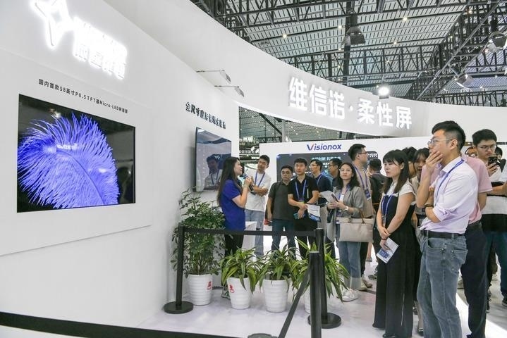 在“2023世界顯示產(chǎn)業(yè)大會新型顯示創(chuàng)新成果展”現(xiàn)場,觀眾在觀看58英寸P0.5TFT基Micro-LED拼接屏(2023年9月7日攝)。新華社記者 唐文豪 攝