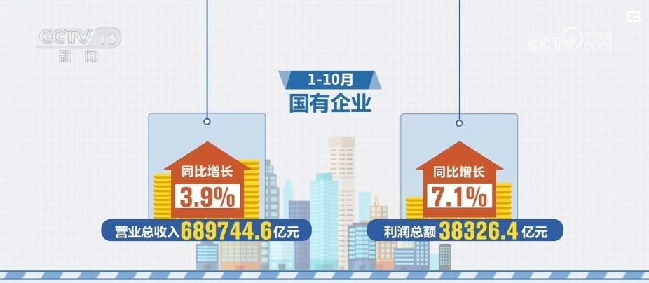 財政部11月30日發(fā)布2023年前10月全國國有企業(yè)經(jīng)濟運行情況。數(shù)據(jù)顯示,1—10月,國有企業(yè)營業(yè)總收入689744.6億元,同比增長3.9%;利潤總額38326.4億元,同比增長7.1%。國有企業(yè)生產(chǎn)經(jīng)營持續(xù)穩(wěn)定恢復,疊加去年同期低基數(shù)因素影響,主要效益指標呈現(xiàn)較快增長。