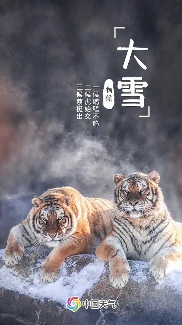 大雪分為三候:一候鹖鴠不鳴,因天氣寒冷,寒號(hào)鳥都不再鳴叫了;二候虎始交,由于此時(shí)是陰氣最盛的時(shí)期,且陽(yáng)氣已有所萌動(dòng),老虎開始有求偶行為;三候荔挺出,“荔挺”是蘭草的一種,它們會(huì)在感到陽(yáng)氣時(shí)抽出新芽。