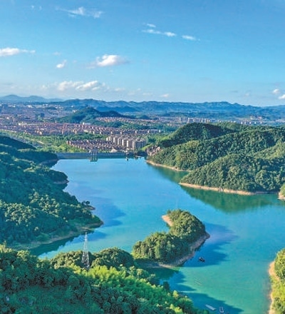 浙江安吉縣鳳凰水庫(kù),碧水藍(lán)天,綠意盎然。