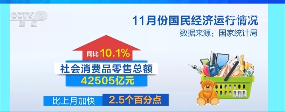 從消費(fèi)看,出行類(lèi)的商品銷(xiāo)售改善,服務(wù)消費(fèi)潛力繼續(xù)釋放,市場(chǎng)銷(xiāo)售增勢(shì)良好。11月份社會(huì)消費(fèi)品零售總額同比增長(zhǎng)10.1%,比上月加快2.5個(gè)百分點(diǎn),其中限額以上單位汽車(chē)類(lèi)商品零售額增長(zhǎng)14.7%,帶動(dòng)作用明顯。