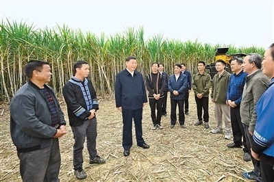 14日下午,習近平到來賓市考察調研。在國家現(xiàn)代農業(yè)產業(yè)園黃安優(yōu)質“雙高”糖料蔗基地,習近平察看萬畝甘蔗林和機械化作業(yè)收割場景,聽取基地情況介紹。他走進甘蔗林,詳細了解甘蔗良種繁育技術要領,同蔗農、農機手和農技人員親切交流。習近平指出,廣西是我國蔗糖主產區(qū),要把這一特色優(yōu)勢產業(yè)做強做大,為保障國家糖業(yè)安全、促進蔗農增收致富發(fā)揮更大作用。要積極培育和推廣良種、提高機械化作業(yè)水平,建設好現(xiàn)代農業(yè)產業(yè)園。要探索建立更加穩(wěn)定的利益聯(lián)結機制,讓廣大農民共享農村改革和發(fā)展成果。他祝愿鄉(xiāng)親們的生活像甘蔗一樣甜蜜。