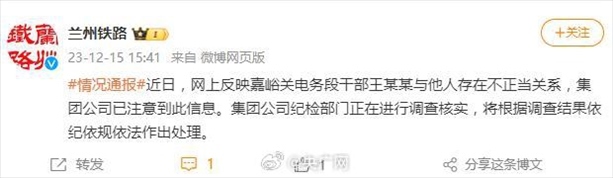 ·網(wǎng)傳國(guó)鐵蘭州局干部與女下屬存不正當(dāng)關(guān)系,官方:紀(jì)檢部門正調(diào)查核實(shí)。