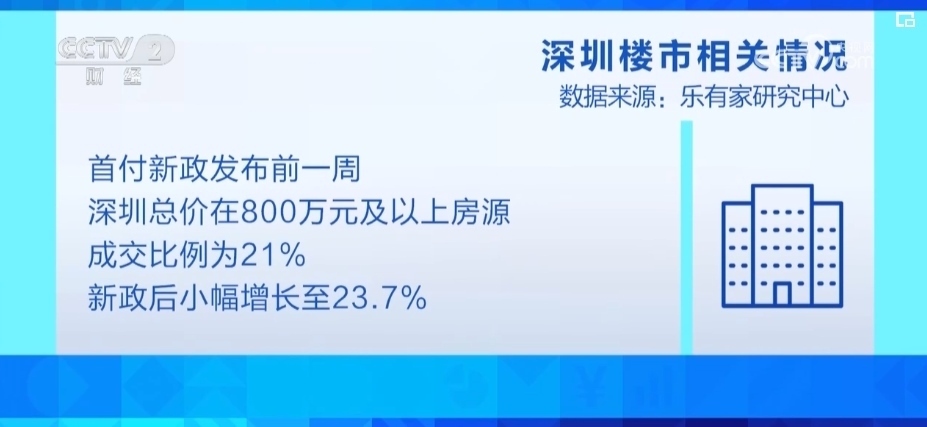 樂有家研究中心監(jiān)測數(shù)據(jù)顯示,首付新政發(fā)布前一周,深圳總價在800萬元及以上房源的成交比例為21%,新政后這一比例小幅增長至23.7%。