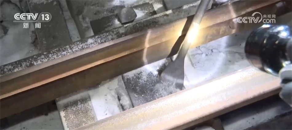 我在車站里看到不僅有給列車編組的司機(jī)、調(diào)度員,我還看到在鐵路的道岔還有很多工作人員正在做一些積雪清掃還有除冰的工作。我們可以湊近看一下,可以看到道岔這里現(xiàn)在是被凍住了,已經(jīng)沒法推動這個鐵軌,而這的空間又非常小,所以只能靠這樣的小鏟子一點(diǎn)點(diǎn)鏟,才能把這塊兒的積雪和冰給清干凈。
