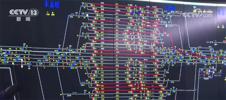 總臺央視記者 張叢婧:我現(xiàn)在是來到了車站的行車指揮室,可以看到這塊大屏幕上實(shí)時顯示著車站的列車狀態(tài),中間這些紅色的線就代表著此時軌道上正在有列車作業(yè)或者等待作業(yè),左邊這些紅色線就意味著現(xiàn)在有列車正在進(jìn)站。