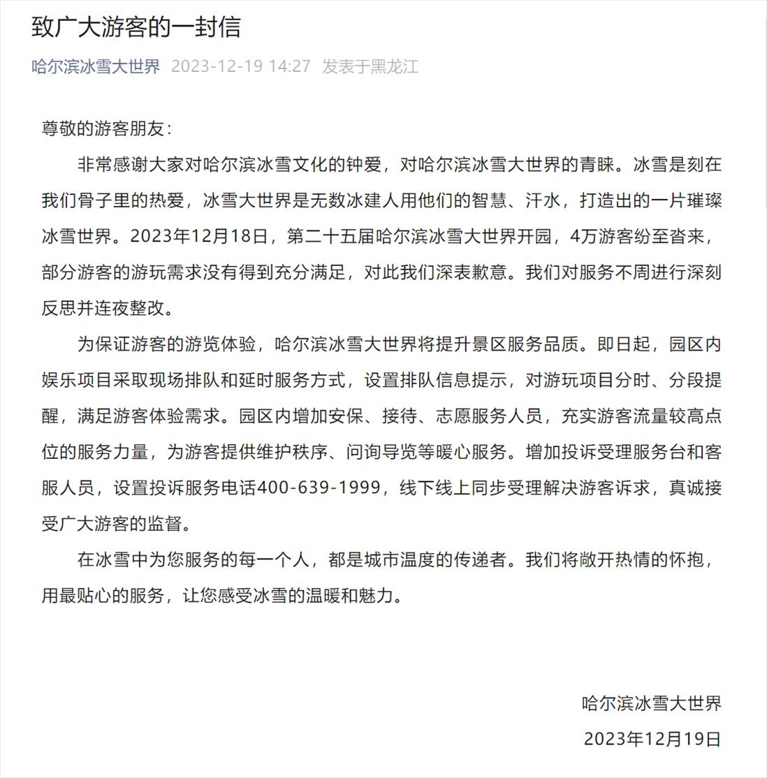 ·哈爾濱冰雪大世界開園首日被喊退票,園區(qū)發(fā)文致歉:連夜整改。當?shù)匚穆镁只貞?yīng)已去現(xiàn)場督導(dǎo)。