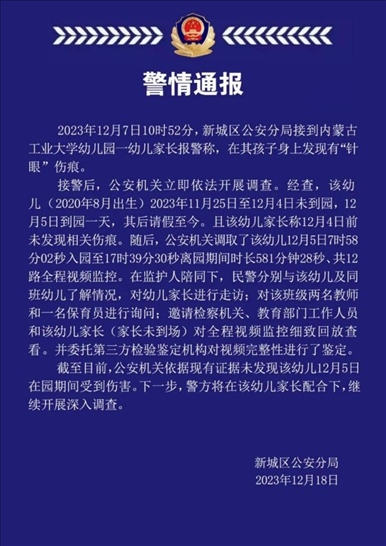 ·呼和浩特警方通報“幼兒身上發(fā)現(xiàn)有‘針眼’傷痕”:未發(fā)現(xiàn)在園期間受到傷害。