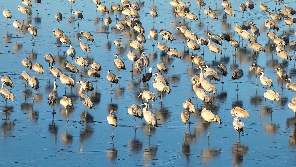 “經(jīng)過(guò)近兩周的密切監(jiān)測(cè),我們已掌握這些鶴的種群數(shù)量、活動(dòng)規(guī)律等情況?;寅Q作為衡水湖的‘老朋友’,屬?lài)?guó)家二級(jí)保護(hù)野生動(dòng)物,每年12月初陸續(xù)遷徙至此,直至次年2月飛返夏季棲息地。由于前段時(shí)間氣溫較高,今年鶴群抵達(dá)衡水湖的時(shí)間稍晚。而去年12月新記錄到的國(guó)家一級(jí)保護(hù)野生動(dòng)物——白頭鶴,這次隨灰鶴再次抵達(dá)。這標(biāo)志著它已認(rèn)準(zhǔn)了衡水湖這個(gè)冬天的‘家’?!?張余廣說(shuō)。