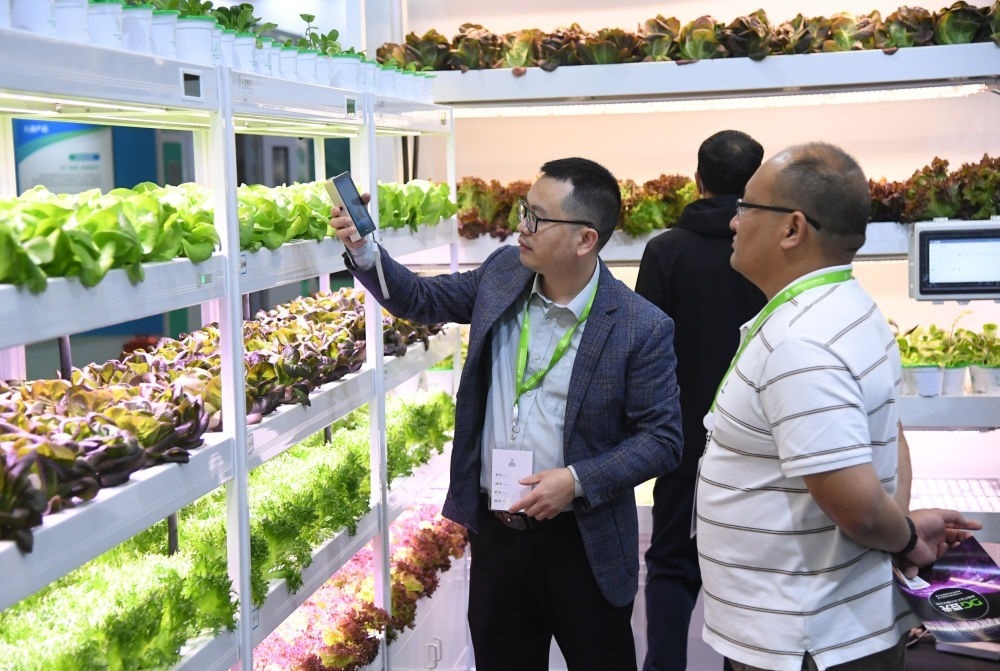 2023世界農(nóng)業(yè)科技創(chuàng)新大會(huì)11月2日至4日在北京舉行。這是2023年11月2日,工作人員(左)在世界農(nóng)業(yè)科技博覽會(huì)現(xiàn)場介紹智慧植物工廠。新華社記者 任超 攝