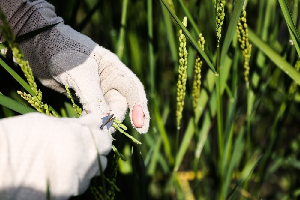 2023年2月22日,青島海水稻研究發(fā)展中心的科研人員于萌在三亞的國家南繁科研育種基地里做水稻雜交實(shí)驗(yàn)。新華社記者 張麗蕓 攝