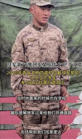 巴丁江措,第76集團(tuán)軍某旅戰(zhàn)士。2010年青海玉樹(shù)地震時(shí),解放軍幫他脫險(xiǎn)。如今,同樣成為解放軍的他奮戰(zhàn)在甘肅抗震救災(zāi)一線(xiàn)。他說(shuō):“我想對(duì)以前救我的人說(shuō),我?guī)椭烁嗳?,讓他們?yōu)槲因湴?!?/p>