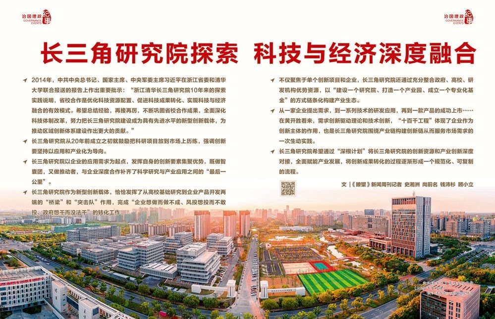 2003年底,在時(shí)任浙江省委書記習(xí)近平的親自推動(dòng)下,浙江清華長(zhǎng)三角研究院(以下簡(jiǎn)稱“長(zhǎng)三角研究院”)正式成立,落地浙江嘉興。作為浙江省人民政府與清華大學(xué)共建的新型創(chuàng)新載體,長(zhǎng)三角研究院成立以來(lái)立足浙江、面向長(zhǎng)三角,以自收自支、市場(chǎng)化運(yùn)營(yíng)探索走出一條省校合作的有效模式,逐步成長(zhǎng)為長(zhǎng)三角區(qū)域重要的產(chǎn)學(xué)研試驗(yàn)平臺(tái)和成果轉(zhuǎn)化基地。