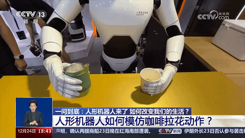 2023年8月,2023世界機(jī)器人大會(huì)在北京開(kāi)幕,現(xiàn)場(chǎng)有個(gè)人形機(jī)器人可以模仿“咖啡拉花”動(dòng)作——開(kāi)始,把兩個(gè)杯子(裝有咖啡、牛奶)遞給人形機(jī)器人;稍后,人形機(jī)器人運(yùn)行AI智能算法,指揮它用“手”完成“咖啡拉花”作業(yè)。