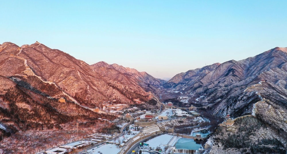 在晨曦中拍攝的雪后司馬臺長城(無人機照片,2023年2月19日攝)。