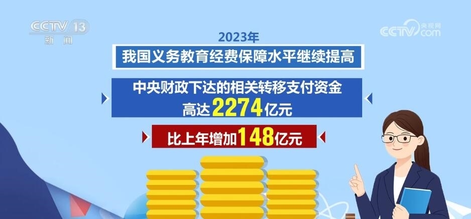 2023年,我國義務(wù)教育經(jīng)費保障水平繼續(xù)提高,中央財政下達(dá)的相關(guān)轉(zhuǎn)移支付資金高達(dá)2274億元,比上年增加148億元。2023年,一系列義務(wù)教育重大工程項目繼續(xù)實施,讓中小學(xué)辦學(xué)條件不斷優(yōu)化。其中,義務(wù)教育薄弱環(huán)節(jié)改善與能力提升項目中央安排330億元,支持各地義務(wù)教育學(xué)校標(biāo)準(zhǔn)化建設(shè)。