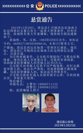 ·海南澄邁發(fā)生一起重大刑案嫌疑人在逃,警方發(fā)布懸賞通告。