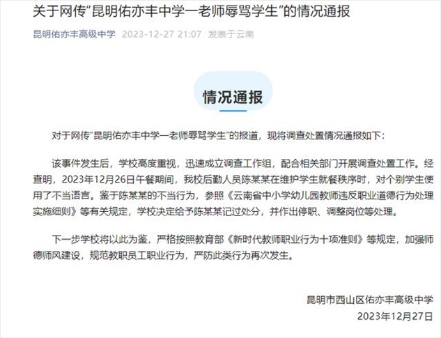·昆明某中學(xué)老師辱罵學(xué)生?校方通報:給予記過、停職、調(diào)整崗位等處理。