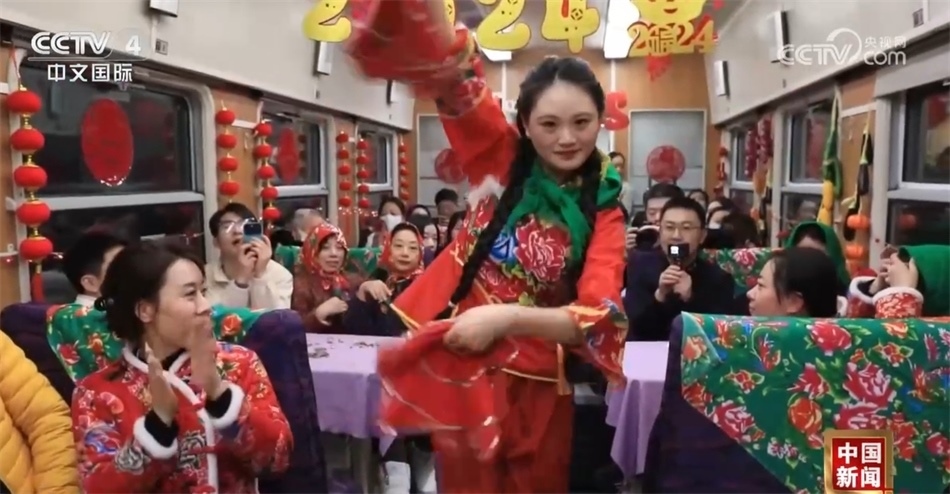 總臺(tái)央視記者 楊曜語(yǔ):我即將登上的列車就是從哈爾濱開(kāi)往漠河的國(guó)內(nèi)首個(gè)沉浸式東北民俗文化體驗(yàn)列車,坐過(guò)的人都說(shuō)一上車就想盤腿兒了,我們趕緊來(lái)體驗(yàn)一下!一上車我就被濃濃的東北文化所感染到了,整個(gè)車廂都被東北大花的經(jīng)典配色裝飾著,再加上隨手就能品嘗到東北特色美食,坐在床鋪上就感覺(jué)一秒鐘“穿越”到農(nóng)家炕頭。