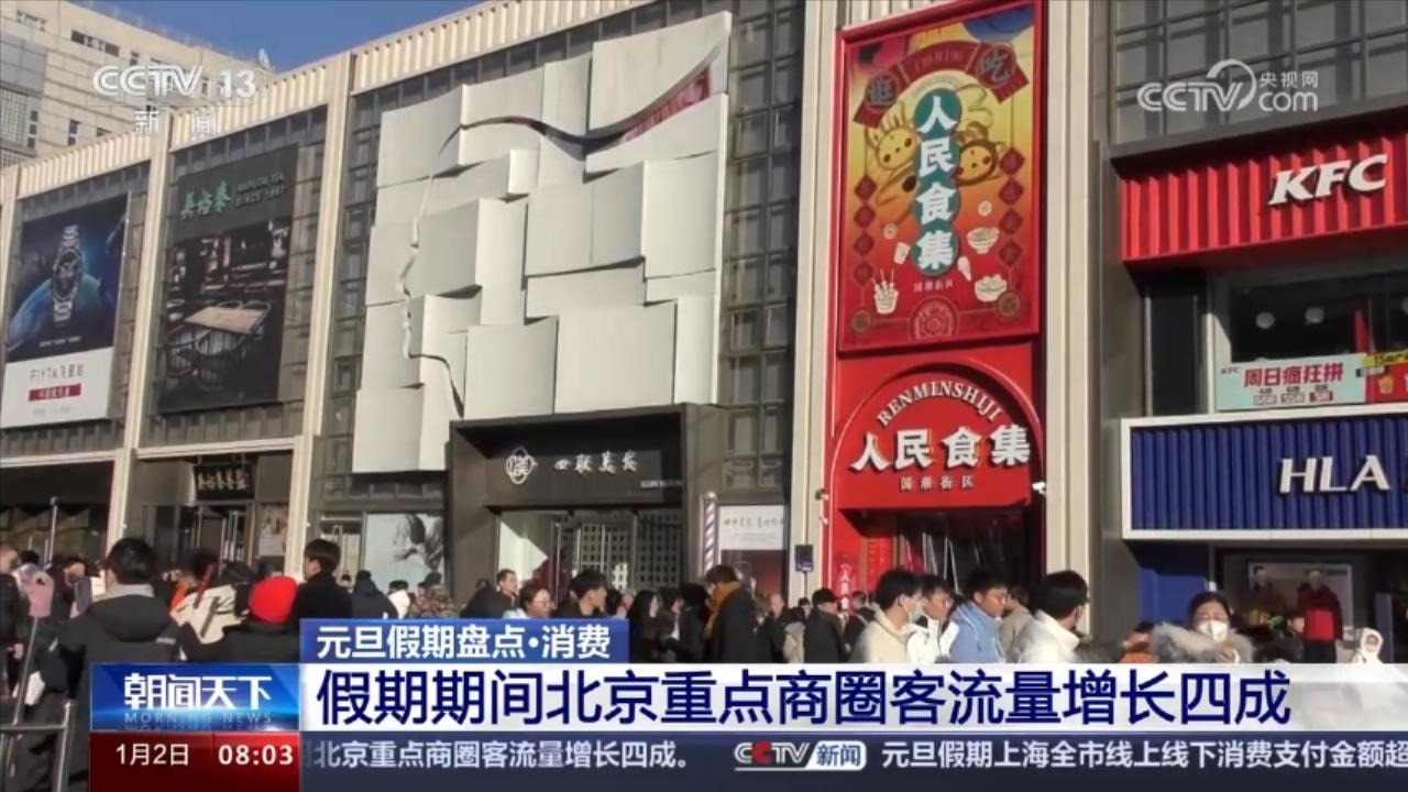 元旦假期期間,北京市商務(wù)局重點監(jiān)測的百貨、超市、專業(yè)專賣店、餐飲和電商等業(yè)態(tài)企業(yè)實現(xiàn)銷售額25.1億元,餐飲消費增勢強(qiáng)勁,同比增長27.9%。北京全市60個重點商圈客流量2217.5萬人次,同比增長40.5%。