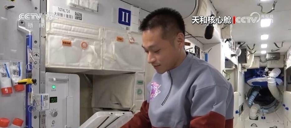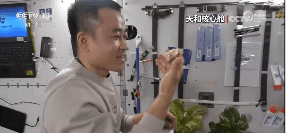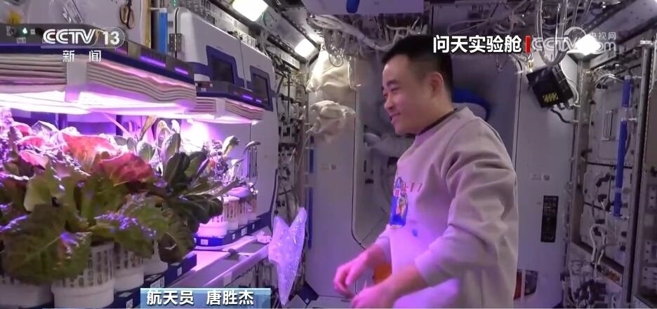 航天員 唐勝杰:你好,我正在對(duì)我們的櫻桃番茄進(jìn)行授粉。因?yàn)樘諞](méi)有小蜜蜂,我就是那只小蜜蜂。大家看一看,這是我們的太空蔬菜,神十七乘組在“太空出差”期間,我們的太空菜園變得更大了,大家看看我們的蔬菜是不是長(zhǎng)勢(shì)喜人?今天是新年的第一天,江新林為我們準(zhǔn)備了營(yíng)養(yǎng)豐盛的太空午餐,但是我覺(jué)得今天應(yīng)該再增加一點(diǎn)綠色的、新鮮的蔬菜,午餐就會(huì)變得更豐盛了。大家可以看一看,看看我們的櫻桃番茄。誒,拿這兩杯,今天中午我們就吃這兩杯。