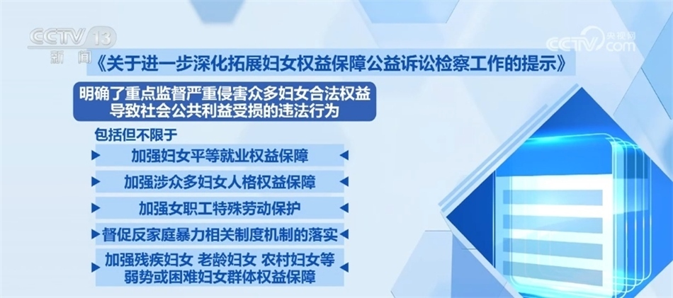 《工作提示》明確了重點(diǎn)監(jiān)督嚴(yán)重侵害眾多婦女合法權(quán)益導(dǎo)致社會(huì)公共利益受損的違法行為,包括但不限于:加強(qiáng)婦女平等就業(yè)權(quán)益保障,加強(qiáng)涉眾多婦女人格權(quán)益保障,加強(qiáng)女職工特殊勞動(dòng)保護(hù),督促反家庭暴力相關(guān)制度機(jī)制的落實(shí),加強(qiáng)殘疾婦女、老齡婦女、農(nóng)村婦女等弱勢(shì)或困難婦女群體權(quán)益保障。同時(shí),針對(duì)其他與眾多婦女權(quán)益密切相關(guān)的領(lǐng)域加強(qiáng)監(jiān)督。