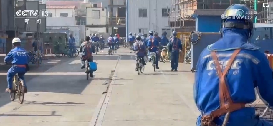 一輛輛各式各樣的自行車(chē)平穩(wěn)穿梭在安全區(qū),車(chē)上的工友有事兒就會(huì)互相召喚,拿出圖紙解決問(wèn)題,互通有無(wú)。而在職工和船東餐廳里,一張張餐桌上分區(qū)標(biāo)記了各個(gè)業(yè)主單位。吃完飯撤掉餐具,大家就開(kāi)始“頭腦風(fēng)暴”,現(xiàn)場(chǎng)辦公。