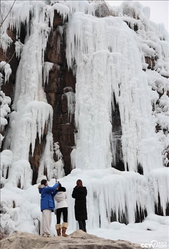 山東沂南,香山湖畔的崖壁上出現(xiàn)冰瀑景觀,冰柱晶瑩剔透蔚為壯觀。
