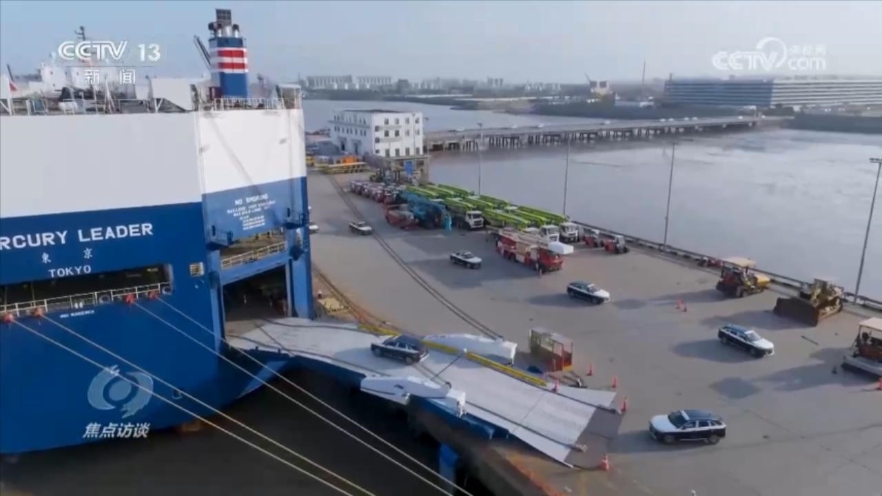 一大早,兩艘遠洋貨輪整裝待發(fā),放眼望去,密密麻麻的汽車準備裝船出海。
