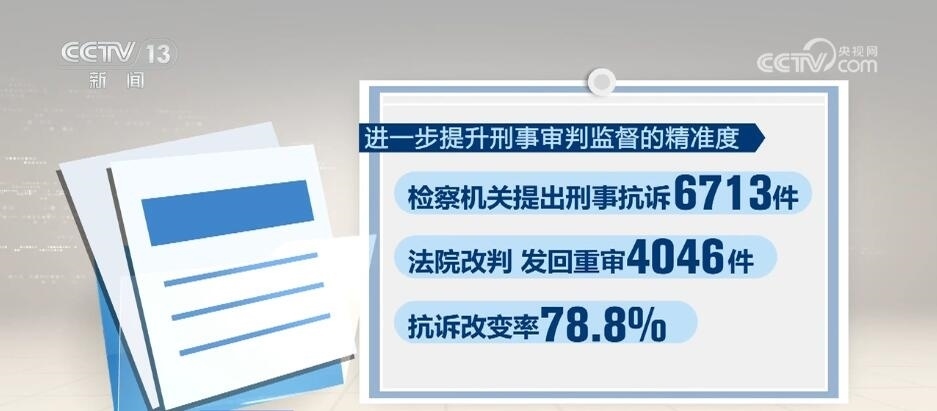 進一步提升刑事審判監(jiān)督的精準度,檢察機關提出刑事抗訴6713件,法院改判、發(fā)回重審4046件,抗訴改變率78.8%。同時,檢察機關深化“派駐+巡回”檢察工作,對不當減刑、假釋、暫予監(jiān)外執(zhí)行共提出糾正意見1.8萬人。
