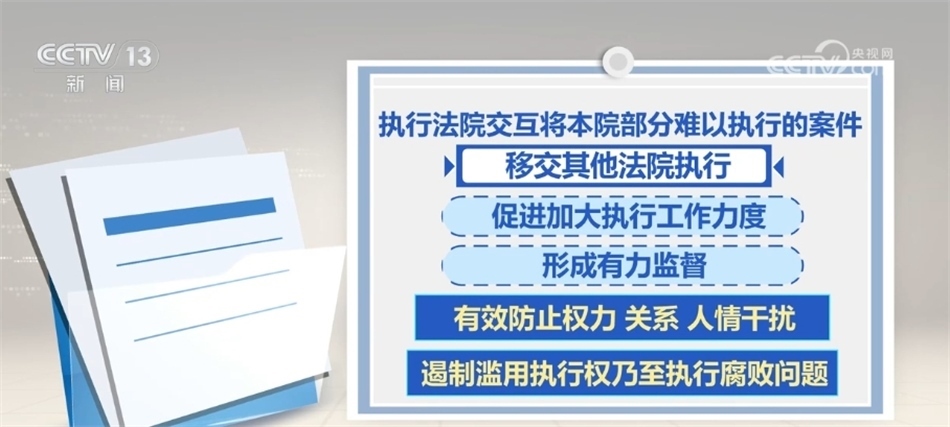 2023年10月,最高人民法院部署開展交叉執(zhí)行工作試點(diǎn)。據(jù)介紹,交叉執(zhí)行是指通過指定、提級(jí)執(zhí)行,執(zhí)行法院交互將本院部分難以執(zhí)行的案件移交其他法院執(zhí)行,促進(jìn)加大執(zhí)行工作力度,并形成有力監(jiān)督,有效防止權(quán)力、關(guān)系、人情干擾,遏制濫用執(zhí)行權(quán)乃至執(zhí)行腐敗問題。