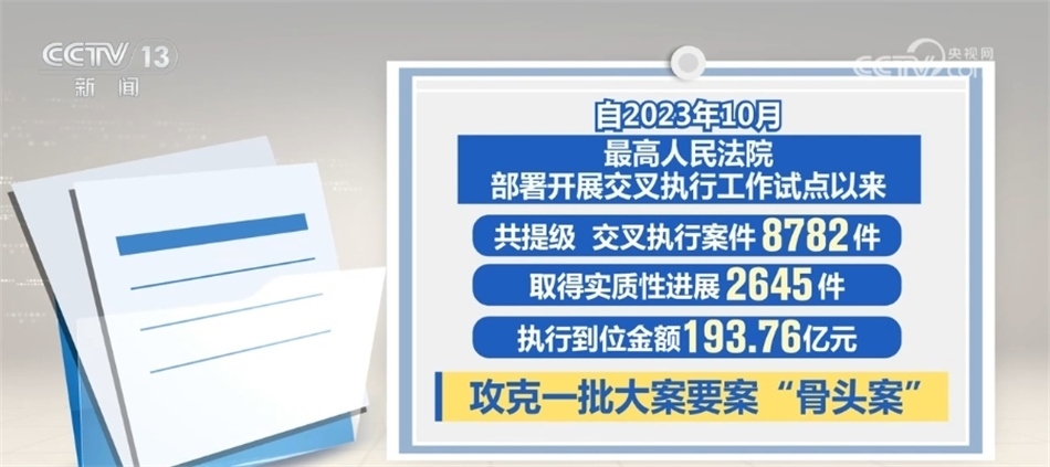 最高人民法院介紹,執(zhí)行難中常見被執(zhí)行人是當(dāng)?shù)刂匾髽I(yè)、納稅大戶,甚至是重點(diǎn)國(guó)企或行政部門等情況。交叉執(zhí)行就是要讓接受指定的法院在不受牽絆、沒有包袱、完全依法自主的條件下力推案件執(zhí)行。據(jù)統(tǒng)計(jì),開展交叉執(zhí)行工作試點(diǎn)以來,共提級(jí)、交叉執(zhí)行案件8782件,取得實(shí)質(zhì)性進(jìn)展2645件,執(zhí)行到位金額193.76億元,攻克了一批大案要案“骨頭案”。最高人民法院要求,上級(jí)法院發(fā)現(xiàn)原執(zhí)行法院存在消極執(zhí)行、拖延執(zhí)行等執(zhí)行不力情形,發(fā)現(xiàn)違紀(jì)違法問題線索的,應(yīng)當(dāng)嚴(yán)肅依紀(jì)依法查處、追究責(zé)任。