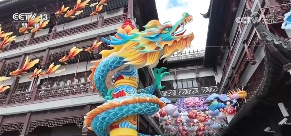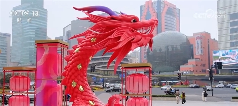 這幾天,南京路上各種龍元素裝置和商品將步行街裝飾一新;在南京西路商圈,這個造型裝置宛若一只巨龍騰空而起,頗有氣勢;在上海徐家匯、中山公園、前灘等商圈,各色龍元素?zé)艚M亮相;在龍華商圈,戲臺也演繹出龍的造型,大街小巷春節(jié)氛圍滿滿。