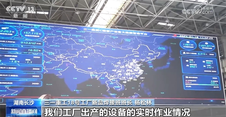 三一重工18號工廠新品焊接班班長 楊松林:來我們“燈塔工廠”參觀,我們都會看到一個超級大的屏幕,每一個閃光點都代表著我們工廠出廠的設(shè)備的實時作業(yè)情況。這些閃光點最后就形成了一個三一的挖掘機指數(shù),就相當于我們業(yè)內(nèi)工程行業(yè)的一個晴雨表,其實我們還是挺自豪的。