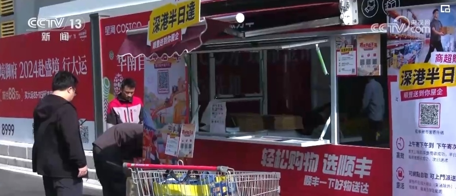 在深圳的這家超市,從出口處向外走兩步,就是快遞公司專門在現場設置的寄送服務點。大包、小包的商品從剛剛推出的購物車里被陸續(xù)裝進打包箱,即發(fā)即走。港澳消費者大概前腳剛到家,后腳就能收到貨。