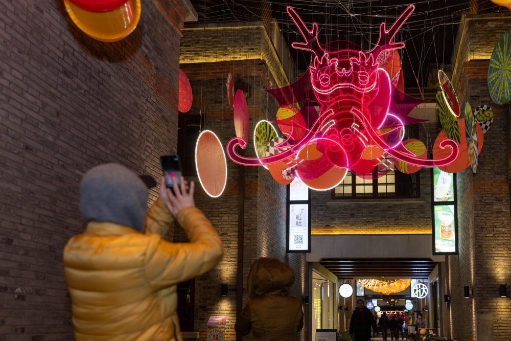 在上海市虹口區(qū)四川北路的“今潮8弄”,人們在龍年燈光藝術(shù)裝置點(diǎn)綴的弄堂中拍照(2024年1月26日攝)。新華社記者 王翔 攝