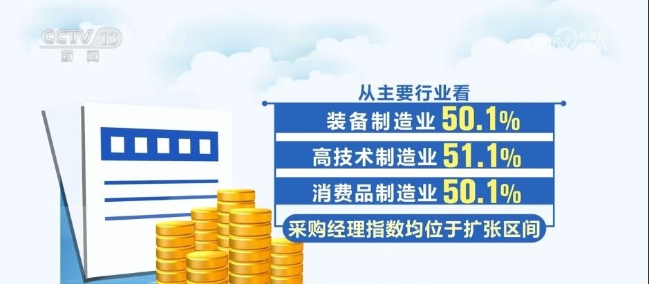 1月份,21個(gè)制造業(yè)行業(yè)中有13個(gè)行業(yè)采購經(jīng)理指數(shù)環(huán)比上升,1個(gè)行業(yè)環(huán)比持平。從主要行業(yè)看,裝備制造業(yè)50.1%、高技術(shù)制造業(yè)51.1%、消費(fèi)品制造業(yè)50.1%,采購經(jīng)理指數(shù)均位于擴(kuò)張區(qū)間。