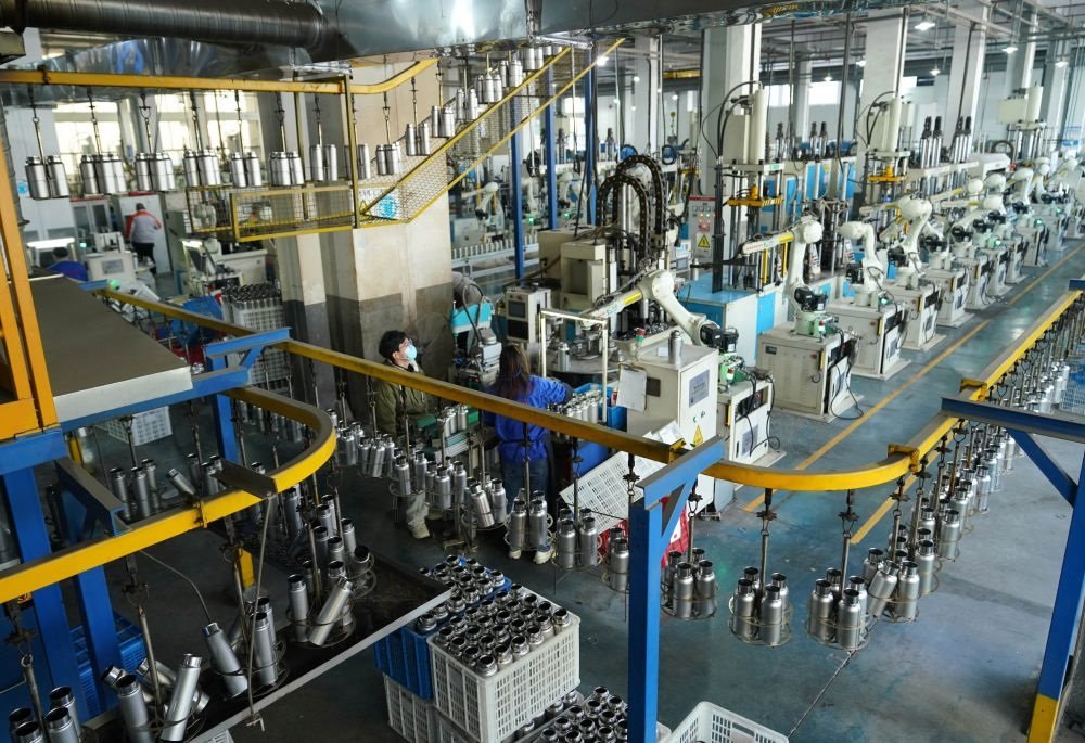 這是2023年12月21日在浙江省永康市一家保溫杯生產企業(yè)拍攝的自動化生產流水線。新華社記者 韓傳號 攝