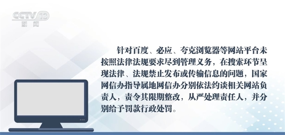 針對(duì)百度、必應(yīng)、夸克瀏覽器等網(wǎng)站平臺(tái)未按照法律法規(guī)要求盡到管理義務(wù),在搜索環(huán)節(jié)呈現(xiàn)法律、法規(guī)禁止發(fā)布或傳輸?shù)男畔栴},國(guó)家網(wǎng)信辦指導(dǎo)屬地網(wǎng)信辦分別依法約談相關(guān)網(wǎng)站負(fù)責(zé)人,責(zé)令其限期整改,從嚴(yán)處理責(zé)任人,并分別給予罰款行政處罰。