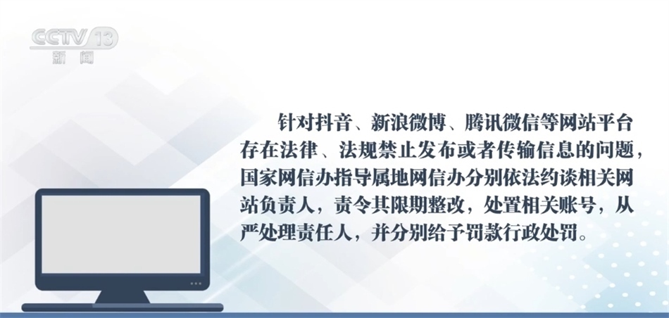 針對(duì)抖音、新浪微博、騰訊微信等網(wǎng)站平臺(tái)存在法律、法規(guī)禁止發(fā)布或者傳輸信息的問題,國(guó)家網(wǎng)信辦指導(dǎo)屬地網(wǎng)信辦分別依法約談相關(guān)網(wǎng)站負(fù)責(zé)人,責(zé)令其限期整改,處置相關(guān)賬號(hào),從嚴(yán)處理責(zé)任人,并分別給予罰款行政處罰。
