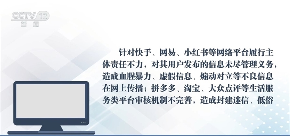 針對(duì)快手、網(wǎng)易、小紅書等網(wǎng)絡(luò)平臺(tái)履行主體責(zé)任不力,對(duì)其用戶發(fā)布的信息未盡管理義務(wù),造成血腥暴力、虛假信息、煽動(dòng)對(duì)立等不良信息在網(wǎng)上傳播;拼多多、淘寶、大眾點(diǎn)評(píng)等生活服務(wù)類平臺(tái)審核機(jī)制不完善,造成封建迷信、低俗色情信息在網(wǎng)上傳播等問題,國(guó)家網(wǎng)信辦指導(dǎo)屬地網(wǎng)信辦分別依法約談相關(guān)網(wǎng)站負(fù)責(zé)人,責(zé)令其限期整改,處置相關(guān)賬號(hào),從嚴(yán)處理責(zé)任人,并分別給予警告、罰款等行政處罰。