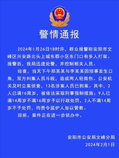 ·河南安陽(yáng)警方通報(bào)一起斗毆案:2人因瑣事?tīng)?zhēng)執(zhí)糾集多人斗毆,13人已到案,其中11人不滿16歲。