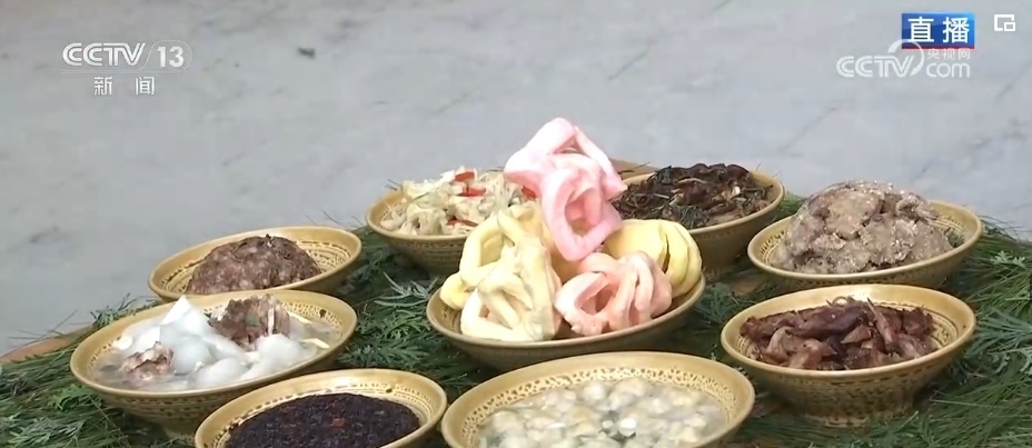 傳統(tǒng)“八大碗”,葷素搭配、香味撲鼻。這個菜叫做麻脆,是村民們過年的時候一定要吃上的美味。麻脆由糯米制作而成,不僅有不同的顏色,還可以制作成花鳥魚蟲、蔬菜水果等多種圖案。龍年到來,村里還特別用蔬果做了一條中國龍。