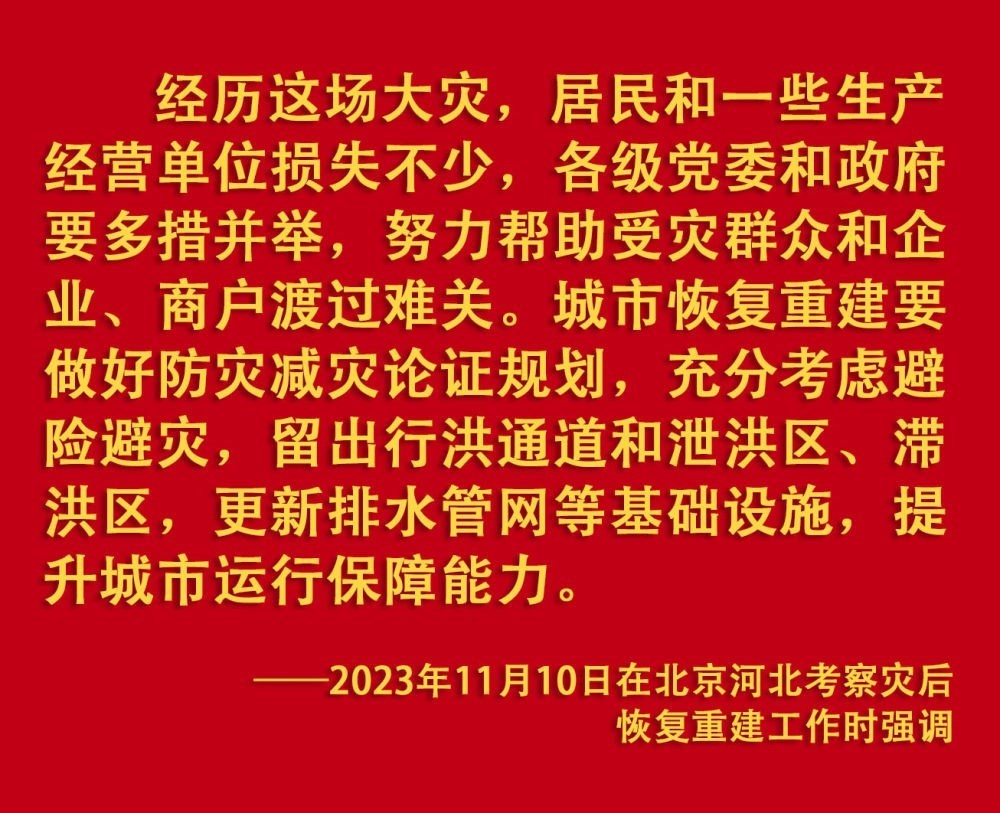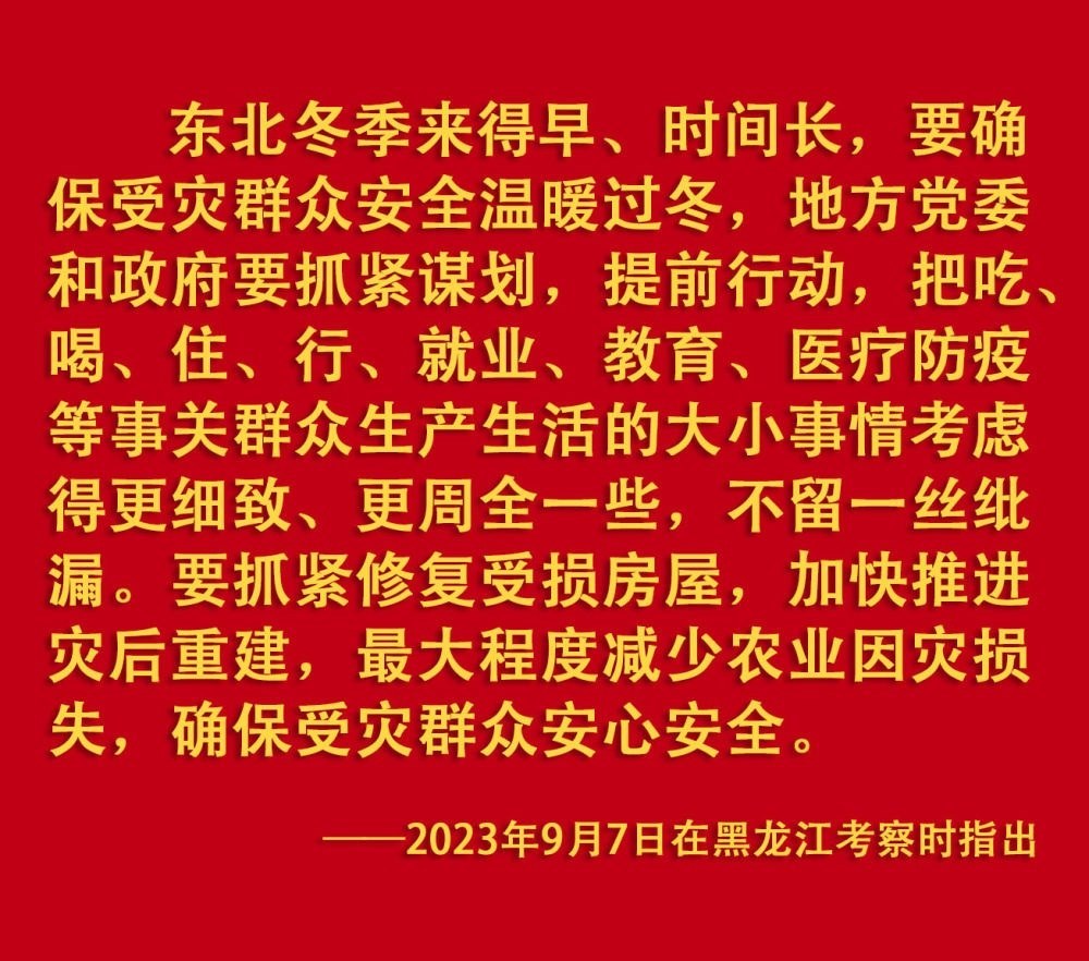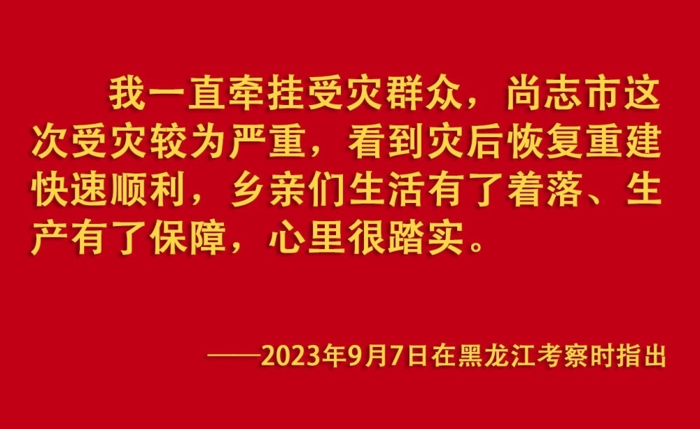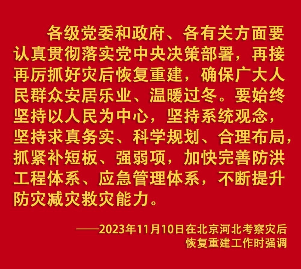2023年汛期以來,我國華北、東北等地出現(xiàn)極端降雨,引發(fā)洪澇和地質(zhì)災害。習近平一直牽掛著受災群眾,高度重視防汛抗洪救災和災后恢復重建工作,多次作出重要指示批示,要求有關(guān)地方和部門全力保障人民群眾生命財產(chǎn)安全,盡快恢復災區(qū)正常生產(chǎn)生活秩序。2023年9月上旬,習近平前往黑龍江尚志市看望慰問受災群眾;11月,北方入冬之際,習近平又來到北京、河北受災較重的相關(guān)地區(qū),看望慰問受災群眾,檢查指導災后恢復重建工作。