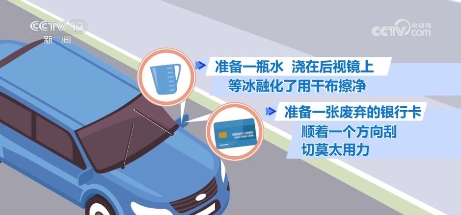 萬一后視鏡被凍住怎么辦呢?如果您的車輛后視鏡具備加熱功能,那這個(gè)問題就很容易解決了。但是如果不具備這樣的功能,有兩樣隨手可得的小物件可以幫您輕易解決。一是準(zhǔn)備一瓶水澆在后視鏡上,等冰融化了用干布擦凈;另外可以準(zhǔn)備一張廢棄的銀行卡,順著一個(gè)方向把后視鏡上的冰刮下來。