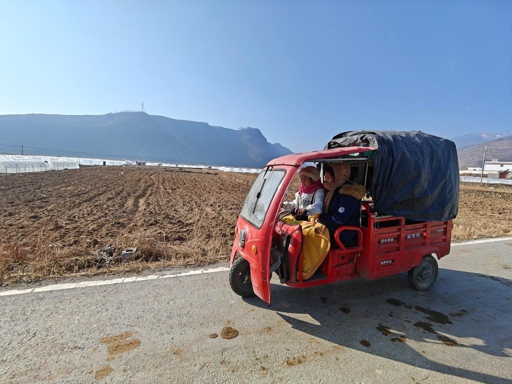 巴木和大女兒騎著三輪車,經(jīng)過烤煙育苗大棚。新華社記者 謝佼 攝