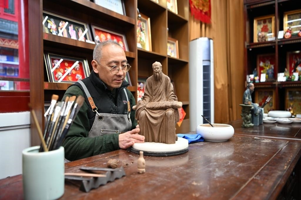 在天津古文化街,泥人張制作部的師傅劉強(qiáng)在店內(nèi)工作。新華社記者李然 攝