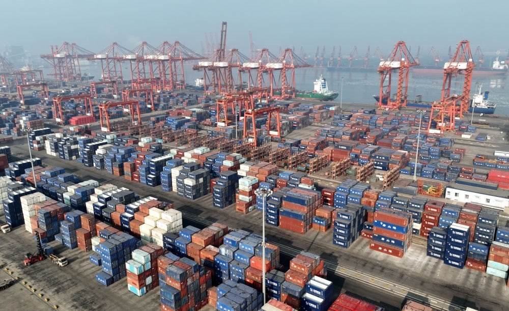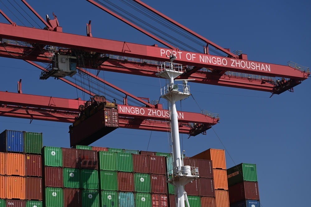 在浙江寧波舟山港梅山港區(qū)碼頭,大型設(shè)備在吊運(yùn)集裝箱(2024年1月24日攝,無(wú)人機(jī)照片)。新華社記者 黃宗治 攝