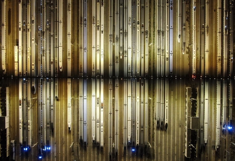 2024年1月26日凌晨,動(dòng)車組列車??吭趶V州動(dòng)車段的存車線上(無(wú)人機(jī)照片)。新華社記者 鄧華 攝